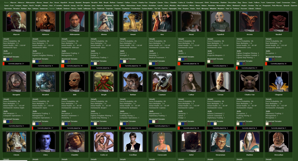 There are over 100 playable races, there are thousands of planets, hundreds of star systems and a cannon map of the galaxy. Each player may only have one account, this is strictly enforced, however players sharing an ip address can apply for a multi account which is monitored to ensure abuse does not take place.