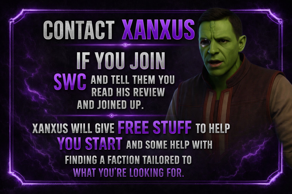 Before we dive into the details, I want to mention that if you reach out to my character in the game or on Discord, Xanxus Drol, I’m happy to help you with some gear and guide you in finding a faction. I have a faction myself, which you can learn more about at Glomtho.com. Keep in mind that factions in SWC often differ from their canonical counterparts.